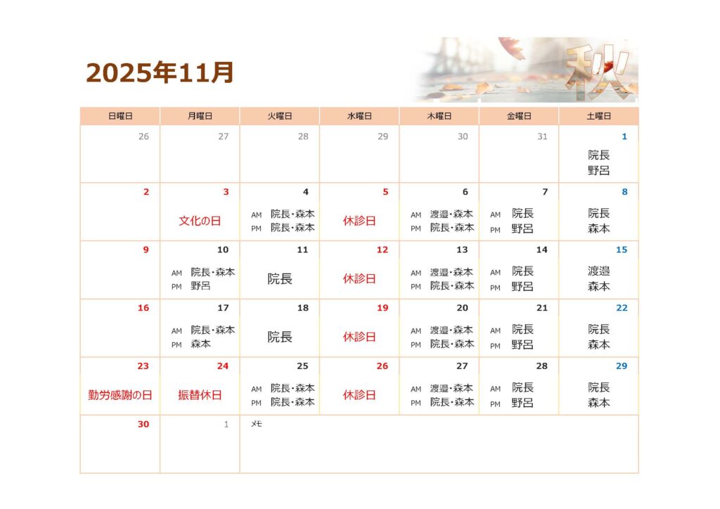 2025/10/28 2025年11月の外来担当医師をお知らせいたします。院長の診察をご希望の方は、診察日をご確認の上ご来院ください。※来院の24時間以内に発熱 (37.5℃以上) されていた方は、 来院前にお電話でご連絡の上、ご来院ください。 混雑状況によっては、お外でお待ちいただく場合も ございます。あらかじめご了承ください。※一般診療受付は 平日午前11:15まで、午後17:45まで、 土曜日11:15までとなります。